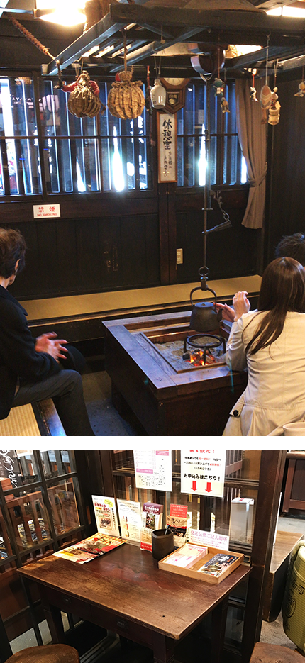 春夏は重厚な町屋造りの下でひんやりと、秋冬はいろりの炭火を眺めながらほっこりと!